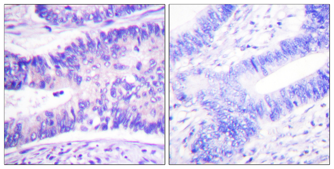 - Immunohistochemistry analysis of paraffin-embedded human colon carcinoma, using WAVE1 (Phospho-Tyr125) Antibody. The picture on the right is blocked with the phospho peptide.