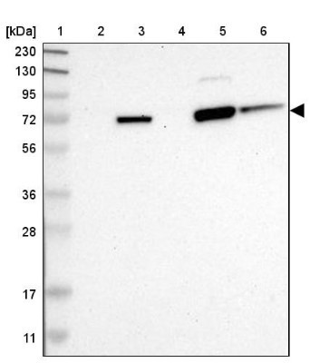 - Western Blot: Annexin A6 Antibody [NBP1-90149] - Lane 1: Marker [kDa] 230, 130, 95, 72, 56, 36, 28, 17, 11. Lane 2: Human cell line RT-4. Lane 3: Human cell line U-251MG sp. Lane 4: Human plasma (IgG/HSA depleted). Lane 5: Human liver tissue. Lane 6: Human tonsil tissue
