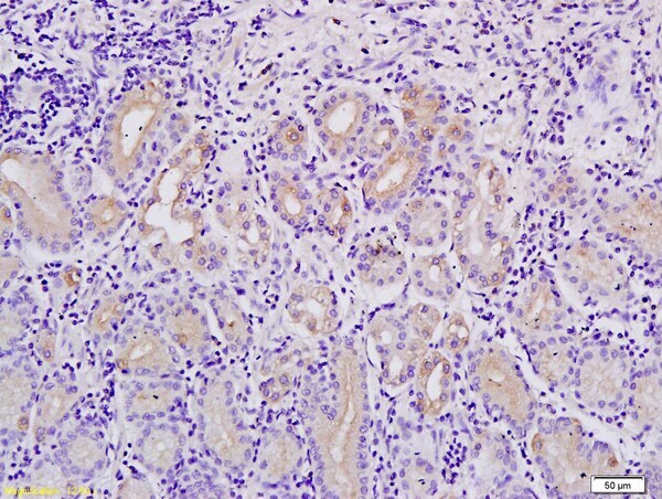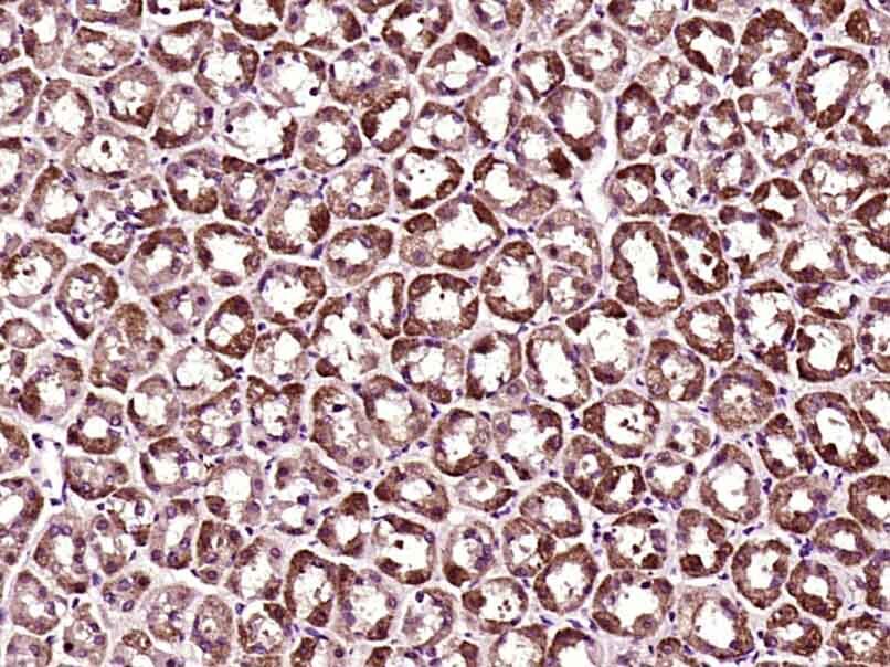 - Paraformaldehyde-fixed, paraffin embedded rat stomach; Antigen retrieval by boiling in sodium citrate buffer (pH6) for 15min; Block endogenous peroxidase by 3% hydrogen peroxide for 30 minutes; Blocking buffer (normal goat serum) at 37°C for 20min; Antibody incubation with MACC1 Polyclonal Antibody, Unconjugated (bs-4293R) at 1:400 overnight at 4°C, followed by a conjugated secondary and DAB staining.