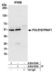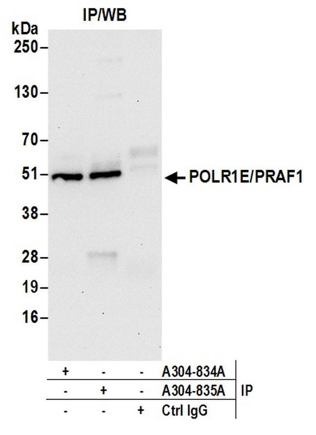 - Detection of human POLR1E/PRAF1 by western blot of immunoprecipitates. Samples: Whole cell lysate (0.5 or 1.0 mg per IP reaction; 20% of IP loaded) from HeLa cells prepared using NETN lysis buffer. Antibody: Affinity purified rabbit anti-POLR1E/PRAF1 antibody A304-835A (lot A304-835A-1) used for IP at 6 µg per reaction. POLR1E/PRAF1 was also immunoprecipitated by rabbit anti-POLR1E/PRAF1 antibody A304-834A. For blotting immunoprecipitated POLR1E/PRAF1, A304-835A was used at 1 µg/ml. Detection: Chemiluminescence with an exposure time of 30 seconds.
