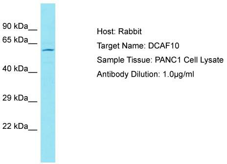 - Host: Rabbit; Target Name: DCAF10; Sample Tissue: PANC1 Whole Cell lysates; Antibody Dilution: 1.0 ug/ml