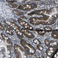 - Immunohistochemical staining of human duodenum shows distinct cytoplasmic positivity in glandular cells.