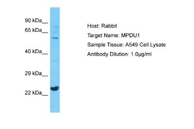 - Western Blot: MPDU1 Antibody [NBP2-83222] - Host: Rabbit. Target Name: MPDU1. Sample Type: A549 Whole Cell lysates. Antibody Dilution: 1.0ug/ml