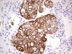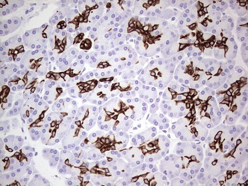 - Immunohistochemical staining of paraffin-embedded human pancreas tissue within the normal limits using anti-KRT19 mouse monoclonal antibody. (TA804003) Dilution: 1:150.