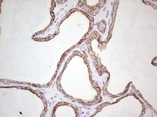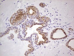 - Immunohistochemical staining of paraffin-embedded human prostate tissue within the normal limits using anti-KRT19 mouse monoclonal antibody. (TA804003) Dilution: 1:150.