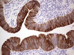 - Immunohistochemical staining of paraffin-embedded Adenocarcinoma of Human colon tissue using anti-KRT19 mouse monoclonal antibody. (TA804003) Dilution: 1:150.