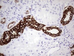 - Immunohistochemical staining of paraffin-embedded human Kidney tissue within the normal limits using anti-KRT19 mouse monoclonal antibody. (TA804003) Dilution: 1:150.