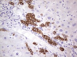- Immunohistochemical staining of paraffin-embedded human liver tissue within the normal limits using anti-KRT19 mouse monoclonal antibody. (TA804003) Dilution: 1:150.