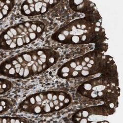 - Immunohistochemical staining of human rectum shows strong cytoplasmic positivity in glandular cells.