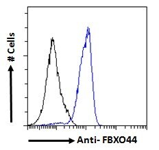 - Flow cytometric analysis of FBXO44 in A431 cells using a polyclonal antibody (Product #PA5-18187). A431 cells (blue line) were paraformaldehyde fixed and permeabilized with 0.5% Triton. The primary antibody was incubated for one hour (10 µg/mL) followed by an Alexa Fluor 488 secondary antibody (1 µg/mL). IgG control: Unimmunized goat IgG (black line) followed by an Alexa Fluor 488 secondary antibody.