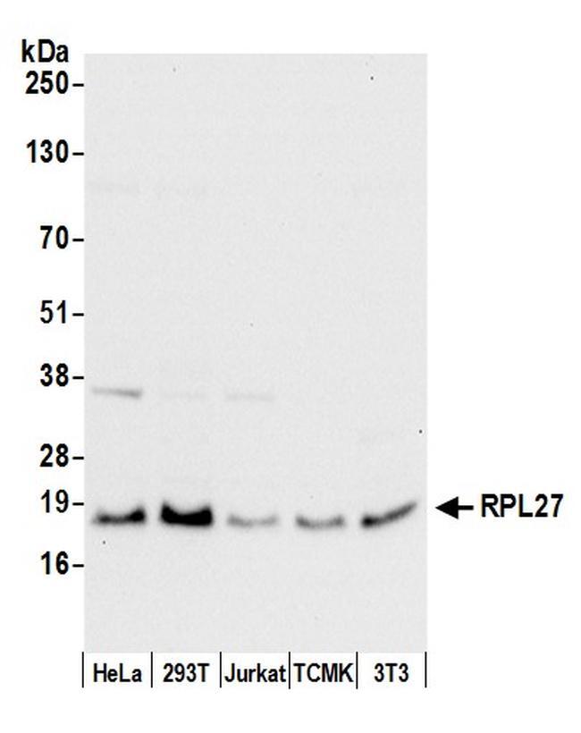 - Detection of human and mouse RPL27 by western blot. Samples: Whole cell lysate (50 µg) from HeLa, 293T, Jurkat, mouse TCMK-1, and mouse NIH3T3 cells prepared using NETN lysis buffer. Antibody: Affinity purified rabbit anti-RPL27 antibody A305-036A-M (lot A305-036A-M-1) used for WB at 1:1000. Detection: Chemiluminescence with an exposure time of 10 seconds.