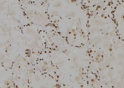 - 1:100 staining human lung tissue by IHC-P. The sample was formaldehyde fixed and a heat mediated antigen retrieval step in citrate buffer was performed. The sample was then blocked and incubated with the antibody for 1.5 hours at 22°C. An HRP conjugated goat anti-rabbit antibody was used as the secondary.