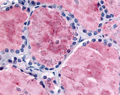 - Human Thyroid (formalin-fixed, paraffin-embedded) stained with PDE8B antibody (GTX85801) at 5 ug/ml followed by biotinylated goat anti-rabbit IgG secondary antibody LS-D1, alkaline phosphatase-streptavidin and chromogen.