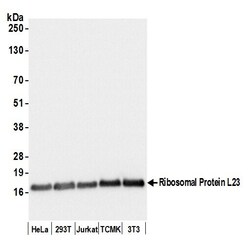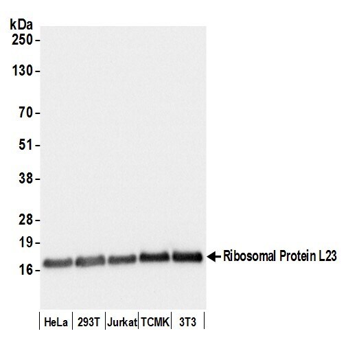 - Detection of human and mouse Ribosomal Protein L23 by western blot. Samples: Whole cell lysate (50 µg) from HeLa, 293T, Jurkat, mouse TCMK-1, and mouse NIH3T3 cells prepared using NETN lysis buffer. Antibody: Affinity purified rabbit anti-Ribosomal Protein L23 antibody A305-010A-M (lot A305-010A-M-1) used for WB at 1:1000. Detection: Chemiluminescence with an exposure time of 1 second.