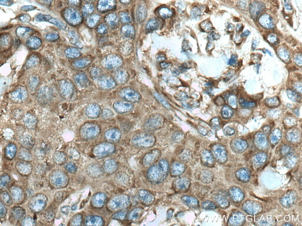 - Immunohistochemical analysis of paraffin-embedded human breast cancer tissue slide using 67683-1-Ig (RPS12 antibody) at dilution of 1:500 (under 40x lens). Heat mediated antigen retrieval with Tris-EDTA buffer (pH 9.0).