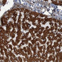 - Immunohistochemical staining of human liver shows strong cytoplasmic positivity in hepatocytes.