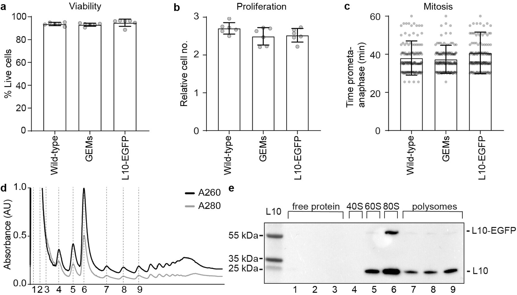 - Extended Data Figure 1. Characterization of GEM and L10 expressing stable cell lines a , Viability of HeLa cell lines stably expressing markers as indicated, measured by counting Hoechst-stained cell nuclei that were negative for the cell death marker TO-PRO-3. Cell numbers: n = 754 (wild-type), n = 930 (GEMs), n = 603 (L10-EGFP). b , Proliferation of HeLa cell lines stably expressing markers as indicated, quantified as fold-change of live cells between 0 and 24 h in time-lapse microscopy videos. Cell number at 24 h: n = 2001 (wild-type), n = 2178 (L10-EGFP), n = 2283 (GEMs). c , Mitotic duration in HeLa cell lines stably expressing markers as indicated, scored by manual measurement of the time from prometaphase to anaphase onset. Cell numbers: n = 320 (wild-type), n = 320 (GEMs), n = 320 (L10-EGFP). d, e , Validation of L10-EGFP incorporation into ribosomes. d , Cell lysate fractions separated on a sucrose gradient. Dashed lines indicate fractions loaded on the gel blotted in ( e ). e , Immunoblot analysis of ribosomal protein L10 in cell lysate fractions, isolated from cells stably expressing L10-EGFP. Annotations of endogenous L10 and L10-EGFP are based on predicted molecular weights. For gel source data, see Supplementary Fig. 1 . Bars indicate mean and error bars represent +- SD.