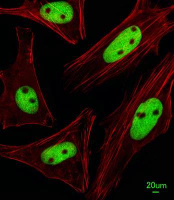 - Immunocytochemistry/Immunofluorescence: KRBA2 Antibody [NBP2-29996] - Immunofluorescent analysis of Hela cells, using (Center) (NBP2-29996). NBP2-29996 was diluted at 1:25 dilution. Alexa Fluor 488-conjugated goat anti-rabbit lgG at 1:400 dilution was used as the secondary antibody (green). Cytoplasmic actin was counterstained with Dylight Fluor 554 (red) conjugated Phalloidin (red).