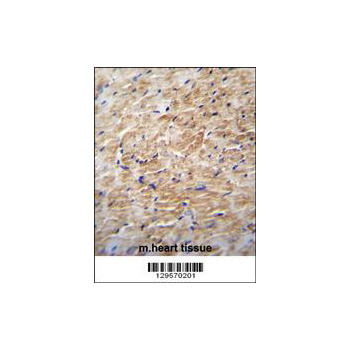 - KRBA2 Antibody (Center) (Cat. #OAAB07677)immunohistochemistry analysis in formalin fixed and paraffin embedded m.heart tissue followed by peroxidase conjugation of the secondary antibody and DAB staining.This data demonstrates the use of KRBA2 Antibody (Center) for immunohistochemistry. Clinical relevance has not been evaluated.
