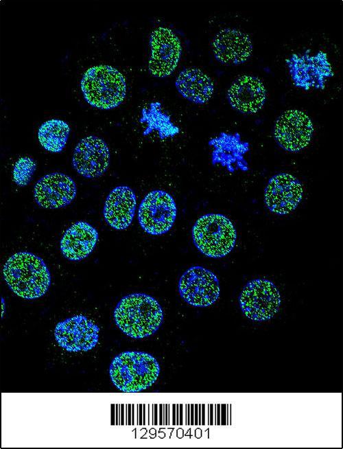 - Confocal immunofluorescent analysis of KRBA2 Antibody (Center)(Cat#OAAB07677) with 293 cell followed by Alexa Fluor 488-conjugated goat anti-rabbit lgG (green). DAPI was used to stain the cell nuclear (blue).