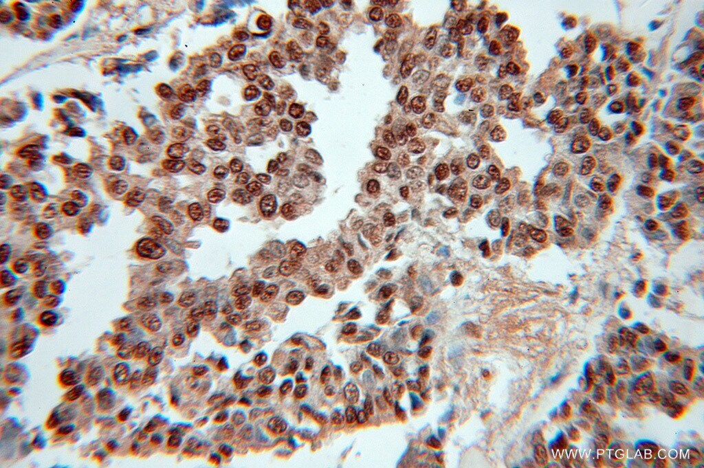 - Immunohistochemistry of paraffin-embedded human breast cancer using 51019-2-AP (RPLP0 antibody) at dilution of 1:50 (under 10x lens).