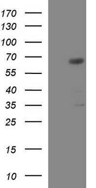 - HEK293T cells were transfected with the pCMV6-ENTRY control (Left lane) or pCMV6-ENTRY GGA2 (RC200153, Right lane) cDNA for 48 hrs and lysed. Equivalent amounts of cell lysates (5 µg per lane) were separated by SDS-PAGE and immunoblotted with anti-GGA2. Positive lysates LY414846 (100 µg) and LC414846 (20 µg) can be purchased separately from OriGene.