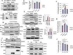 - Fig. 4 SEMG1 and SEMG2 interact with PKM2 and LDHA, upregulates their protein level and enzymatic activity. Recombinant SEMG1 and SEMG2 bind PKM2, whereas SEMG1 only binds LDHA in GST pull-down assay followed by western-blotting. B 3xFlag-tagged SEMG1 and SEMG2 bind PKM2, whereas SEMG1 only binds LDHA in co-immunoprecipitation. C 3xFlag-tagged PKM2 interacts with both endogenous SEMG1 and SEMG2 in H520 cells, whereas 3xFlag-tagged LDHA binds SEMG1 only (co-immunoprecipitation). D Overexpression of SEMG1 and SEMG2 in H1299 cell line does not alters the mRNA levels of PKM2 and LDHA (Real-Time PCR). The stable overexpression of SEMG1 and SEMG2 increase the protein level and enzymatic activity of PKM2, whereas the overexpression of SEMG1 only elevates the protein level and enzymatic activity of LDHA in E , F H1299 cells and G , H Mia-Paca 2 cells. Knockdown of SEMG1 and SEMG2 in H520 cells decreases the protein level ( I ) and enzymatic activity ( J ) of PKM2 and LDHA. Three biological replicates were used for all quantifications, data are presented as mean +- S.D., * P < 0.05.