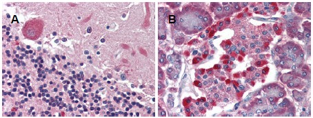 - AM08455PU-N LGR4 antibody staining of various Human tissues at the membrane of cells at 5 µg/ml. A: Brain cerebellum, B: Pancreas islet. Strongly positive staining is noted in subsets of cells within the islets of Langerhans. Moderately positive staiing was observed in Purkinje and Golgi neurons of the cerebellum, adrenal medulla, neuroendocrine cells, hepatocytes, lung macrophages, seminiferous tubules and Leydig cells of the testis. Faintly to moderately positive staining was also observed in cardiac myocytes and renal tubules, granulocytes, and subsets of lymphocytes. Some elastin background staining is noted. Tissue was formalin fixed and paraffin embedded. No pretreatment of sample was required. The image shows the localization of antibody as the precipitated red signal, with a hematoxylin purple nuclear counterstain. Personal communication, Andrew Elston, Lifespan Biosciences, Seattle, WA.