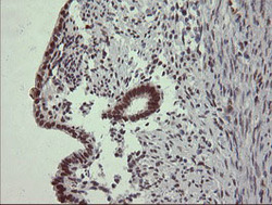 - Immunohistochemical staining of paraffin-embedded Human endometrium tissue within the normal limits using anti-TRIM22 mouse monoclonal antibody. (Heat-induced epitope retrieval by 10mM citric buffer, pH6.0, 120C for 3min, TA505281)