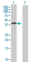 - Western Blot analysis of SSBP2 expression in transfected 293T cell line (H00023635-T02) by SSBP2 MaxPab polyclonal antibody.Lane 1: SSBP2 transfected lysate(39.71 KDa).Lane 2: Non-transfected lysate.