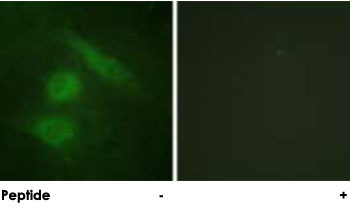 - Immunofluorescence analysis of HeLa cells, using IRF3 polyclonal antibody (Cat # PAB18181).Peptide "+" means "peptide blocking".