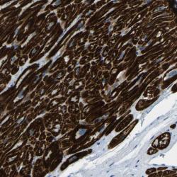 - Immunohistochemical staining of human heart muscle shows strong cytoplasmic positivity in myocytes.
