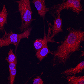 - Crossveinless-2/CV-2 in HUVEC Human Cells. Crossveinless-2/CV-2 was detected in immersion fixed HUVEC human umbilical vein endothelial cells using Human Crossveinless-2/CV-2 Antigen Affinity-purified Polyclonal Antibody (Catalog # AF1956) at 10 µg/mL for 3 hours at room temperature. Cells were stained using the NorthernLights™ 557-conjugated Anti-Sheep IgG Secondary Antibody (red; Catalog # NL010) and counterstained with DAPI (blue). Specific staining was localized to cytoplasm. View our protocol for Fluorescent ICC Staining of Cells on Coverslips.