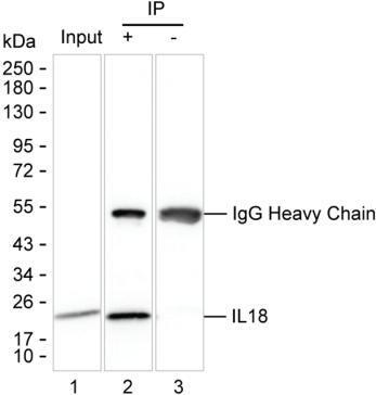 - Immunoprecipitation of IL-18 in 200 µg of U-2 OS lysate. Samples are as follows: Lane 1: U-2 OS lysate, Lane 2: IL-18 immunoprecipitated from U-2 OS lysate, Lane3: The same as Lane 2 but KT82 was used as IgG isotype control antibody. After absorption with Protein G beads, the mixture was run on 6-18% SDS-PAGE, blotted onto nitrocellulose membrane, and peroxidase conjugated goat anti-mouse IgG (Fc specific) was used as the secondary antibody. The isotype control antibody was KT82. Incubation of samples with IL-18 monoclonal antibody (Product # MA5-55867) at a dilution of 2.5 µg was used.