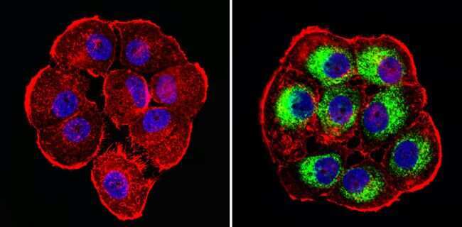 - Immunofluorescent analysis of CD227/MUC1/Mucin 1 (green) showing staining in the in the cytoplasm and membrane of MCF-7 cells (right) compared to a negative control without primary antibody (left). Formalin-fixed cells were permeabilized with 0.1% Triton X-100 in TBS for 5-10 minutes and blocked with 3% BSA-PBS for 30 minutes at room temperature. Cells were probed with a CD227/MUC1/Mucin 1 monoclonal antibody (Product # MA5-11202) in 3% BSA-PBS at a dilution of 1:50 and incubated overnight at 4ºC in a humidified chamber. Cells were washed with PBST and incubated with a DyLight-conjugated secondary antibody in PBS at room temperature in the dark. F-actin (red) was stained with a fluorescent red phalloidin and nuclei (blue) were stained with Hoechst or DAPI. Images were taken at a magnification of 60x.