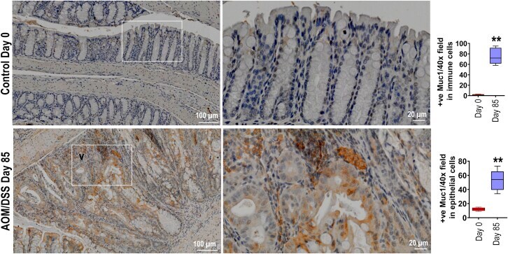 - Figure 12 MUC1 is upregulated in both tumor and immune cells in repose to AOM/DSS. MUC1 IHC staining colon section from WT mice ether treated with AOM followed by DSS as per Figure 1 , A at day 85 or untreated at day 0 (n >= 6). Statistics: box plots show median, quartiles and range. Mann-Whitney U test. * vs Day 0, ** P < .01. The data are representative of 3 independent experiments.