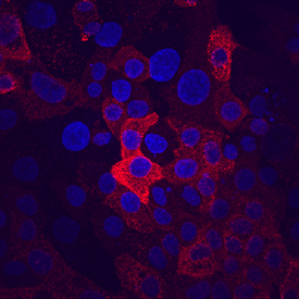 - MUC-1 in Capan-1 Human Cell Line. MUC-1 was detected in immersion fixed Capan-1 human pancreatic adenocarcinoma cell line using Mouse Anti-Human MUC-1 Monoclonal Antibody (Catalog # MAB6298) at 10 µg/mL for 3 hours at room temperature. Cells were stained using the NorthernLights™ 557-conjugated Anti-Mouse IgG Secondary Antibody (red; Catalog # NL007) and counterstained with DAPI (blue). Specific staining was localized to cell surfaces and cytoplasm. View our protocol for Fluorescent ICC Staining of Cells on Coverslips.