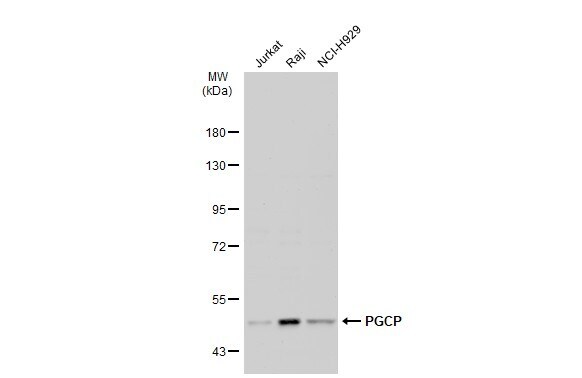 - Western Blot using PGCP Polyclonal Antibody (Product # PA5-21489). Various whole cell extracts (30 µg) were separated by 7.5% SDS-PAGE, and the membrane was blotted with PGCP Polyclonal Antibody (Product # PA5-21489) diluted at 1:500. The HRP-conjugated anti-rabbit IgG antibody was used to detect the primary antibody.