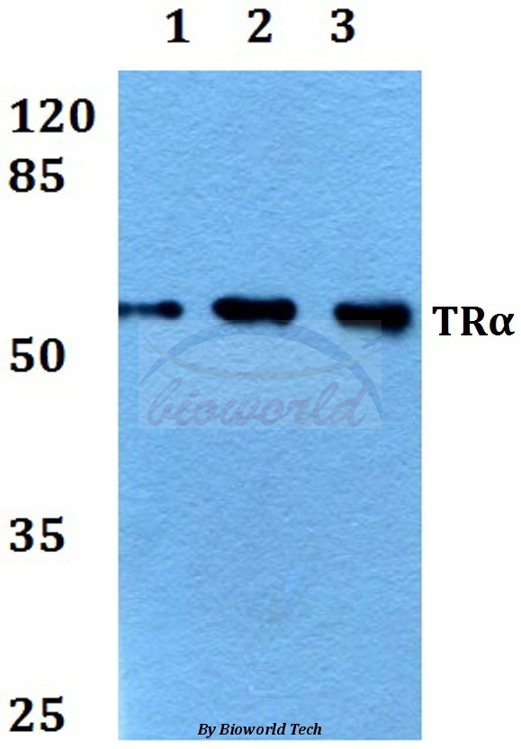 - Western blot (WB) analysis of TR¦Á (A19) pAb at 1:500 dilutionLane1:MCF-7 whole cell lysateLane2:sp2/0 whole cell lysateLane3:H9C2 whole cell lysate