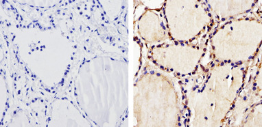 - Immunohistochemistry analysis of Thyroid Hormone Receptor alpha-1 showing staining in the cytoplasm and nucleus of paraffin-treated human thyroid tissue (right) compared with a negative control in the absence of primary antibody (left). To expose target proteins, antigen retrieval was performed using 10mM sodium citrate (pH 6.0), microwaved for 8-15 min. Following antigen retrieval, tissues were blocked in 3% H2O2-methanol for 15 min at room temperature, washed with ddH2O and PBS, and then probed with a Thyroid Hormone Receptor alpha-1 polyclonal antibody (GTX25621) diluted by 3% BSA-PBS at a dilution of 1:500 overnight at 4¢XC in a humidified chamber. Tissues were washed extensively in PBST and detection was performed using an HRP-conjugated secondary antibody followed by colorimetric detection using a DAB kit. Tissues were counterstained with hematoxylin and dehydrated with ethanol and xylene to prep for mounting.