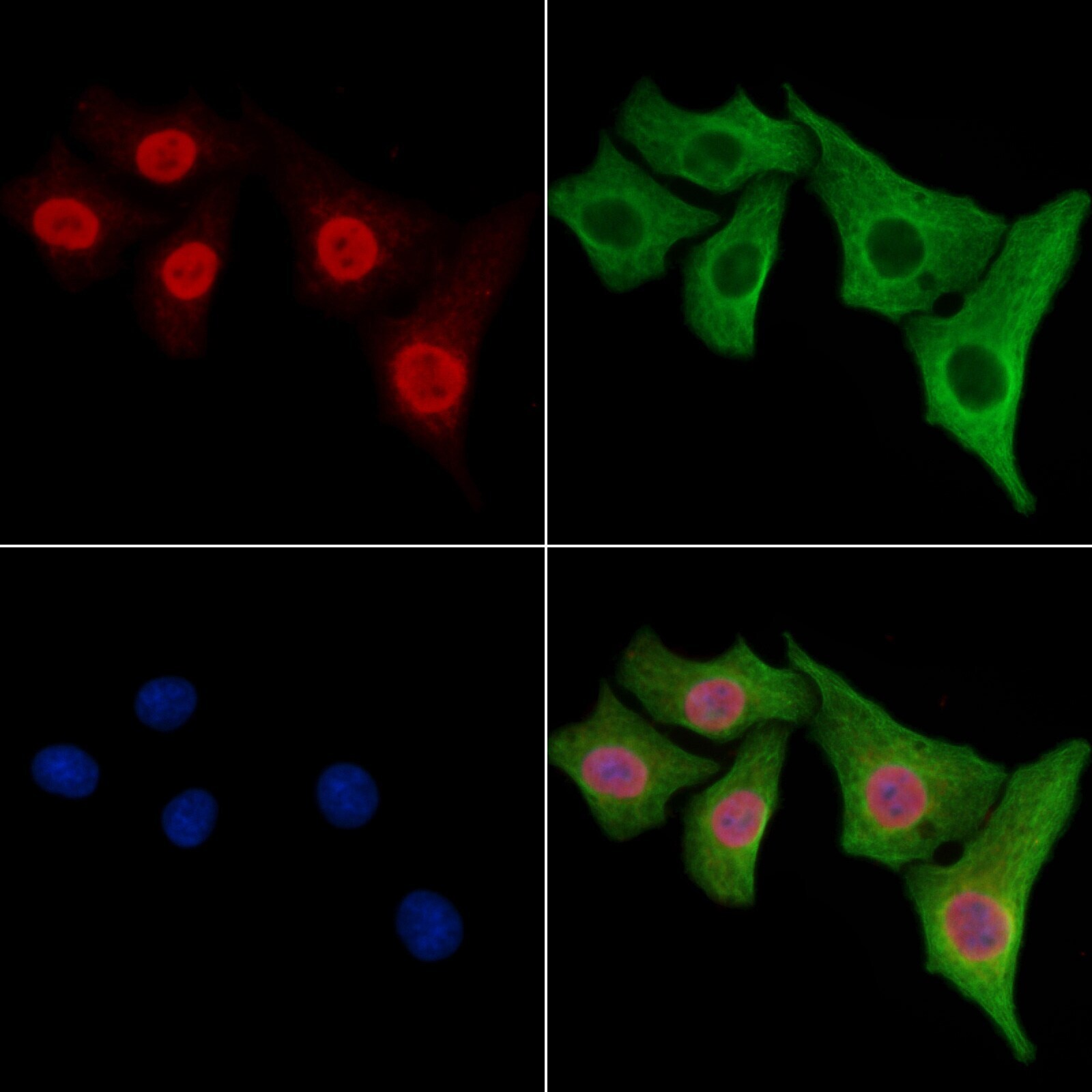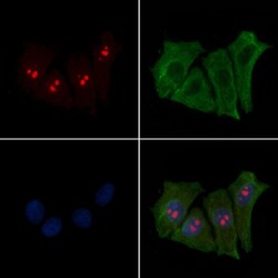 - Immunocytochemistry analysis of FUS in Hela cells. The samples were fixed with PFA and permeabilized in 0.1% Triton X-100, then blocked in 10% serum for 45 minutes at 25°C. Samples were incubated with FUS polyclonal antibody (Product # PA5-103084) and mouse anti-beta tubulin antibody for 1 hour at 37°C. An AlexaFluor594 conjugated goat anti-rabbit IgG(H+L) (Red) and an AlexaFluor488 conjugated goat anti-mouse IgG(H+L) (Green) were used as the secondary antibodies. The nuclear counter stain is DAPI (blue).
