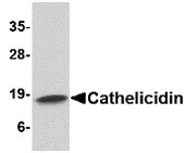 - Western Blot analysis of Cathelicidin in Human spleen tissue lysate with Cathelicidin Polyclonal Antibody (Product # PA5-20513) at 1 µg/mL.