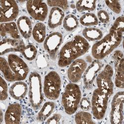 - Immunohistochemical staining of human kidney shows strong cytoplasmic and nuclear positivity in renal cells.
