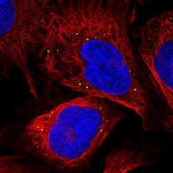 - Immunofluorescent staining of MAK10 in human cell line U-2 OS shows localization to vesicles. Samples were probed using a MAK10 Polyclonal Antibody (Product # PA5-65672).