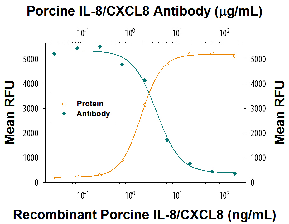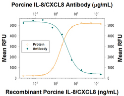 - Chemotaxis Induced by IL-8/CXCL8 and Neutralization by Porcine IL-8/CXCL8 Antibody. Recombinant Porcine IL-8/CXCL8 (Catalog # 535-IN) chemoattracts the BaF3 mouse pro-B cell line transfected with human CXCR2 in a dose-dependent manner (orange line). The amount of cells that migrated through to the lower chemotaxis chamber was measured by Resazurin (Catalog # AR002). Chemotaxis elicited by Recombinant Porcine IL-8/CXCL8 (50 ng/mL) is neutralized (green line) by increasing concentrations of Porcine IL-8/CXCL8 Monoclonal Antibody (Catalog # MAB5351). The ND50 is typically 1-6 µg/mL.