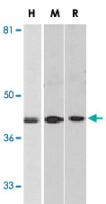 - Western blot analysis of DAPK2 in A-431 (H), mouse spleen (M), and rat kidney (R) lysates with DAPK2 polyclonal antibody (Cat # PAB12854) at 1 ug/mL .