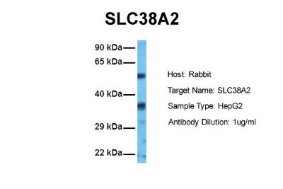 - Western Blot: SLC38A2 Antibody [NBP2-83554] - Host: Rabbit. Target Name: SLC38A2. Sample Tissue: Human HepG2. Antibody Dilution: 1.0ug/ml