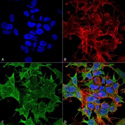 - Immunofluorescent analysis of KCNK3 in human neuroblastoma cell line (SK-N-BE). Sample was fixed with 4% formaldehyde (15 min at RT), incubated with KCNK3 monoclonal antibody (Product # MA5-27677) using a dilution of 1:100 (1 hour at RT), and followed by Goat Anti-Mouse 488, Phalloidin Texas Red and DAPI secondary antibody at a dilution of 1:100, 1:1000 (60 min at RT) and 1:5000 (5 min at RT). Images are shown as follows: (A) DAPI (blue) nuclear stain, B) Phalloidin Texas Red F-Actin stain, C) TASK1 Potassium Channel Antibody, D) Merged image. Magnification: 60x.