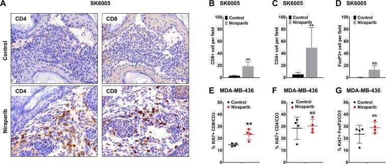 - Figure 2 Niraparib promoted tumor immune cell infiltration in both the BRCA -proficient SK6005 syngeneic and BRCA -deficient MDA-MB-436 NOG-EXL humanized tumor models ( A ) Representative images of CD4 and CD8 immunohistochemical staining in control- and niraparib-treated BRCA -proficient SK6005 tumors. ( B - D ) Quantification of the number of CD4 + cells, CD8 + cells and FoxP3 + cells per field upon niraparib treatment in BRCA -proficient SK6005 tumors. ( E-G ) Percentage of Ki67-positive CD4 + cells, CD8 + cells and FoxP3 + cells among the total CD3 + population by flow cytometry in humanized NOG-EXL MDA-MB-436 tumors. **p-value is less than 0.05 by Student''s t test.