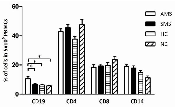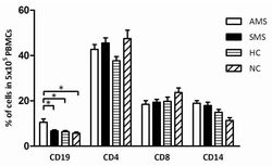 - Figure 3 Flow cytometric analysis of different leukocyte populations in PBMCs isolated from patients with active MS (AMS), stable MS patients (SMS), healthy individuals (HC), and neurological non-inflammatory controls (NC) . The bars represent the percentage of CD19, CD4, CD8, and CD14 cells in 5 x 10 6 PBMCs. The mean values and the standard error for each group are presented, and the significant differences ( P